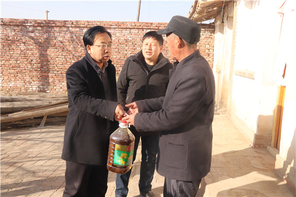 在村委会主任邓清生的带领下, 赵荣明一行来到贫困户家中,这些贫困户多为贫病老人,生活不便,经济困难。赵荣明像关心自己的亲人一样,与每一位老人亲切交谈,嘘寒问暖,了解他们的身体状况和经济来源,询问他们生活上的困难,嘱咐他们保重身体、积极生活,并为他们送上了面粉与食用油,祝愿老人们身体健康、生活幸福。贫困户顾九天激动地说:“太感谢你们了,谢谢你们对我的关心,市政集团已经帮我闺女在给排水公司找到了工作,你们还来看望我,谢谢你们,我一定好好生活,争取早日脱贫!”