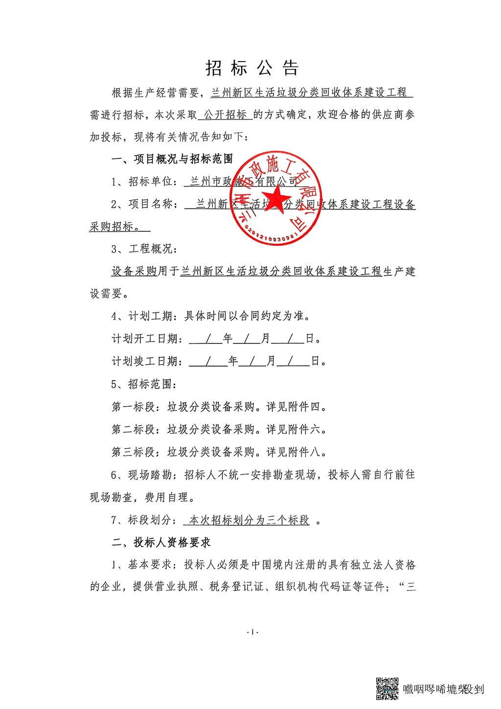兰州市政施工有限公司兰州新区生活垃圾分类回收体系建设工程设备采购招标公告