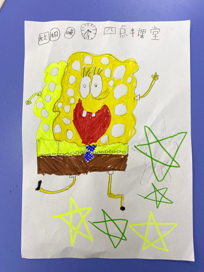 本次授课主要围绕“海绵宝宝和派大星”进行简笔卡通绘画。通过讲解示范让小朋友们知道具体的绘画步骤,在小朋友绘画创作的同时进行指导修改。不一会儿,一幅幅精美的作品就呈现在大家的眼前了。