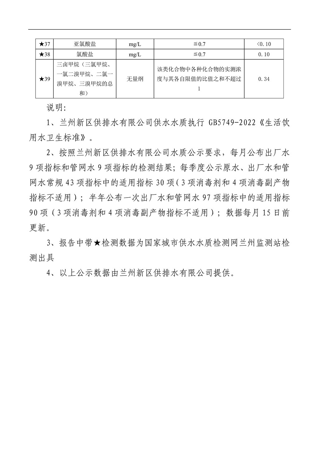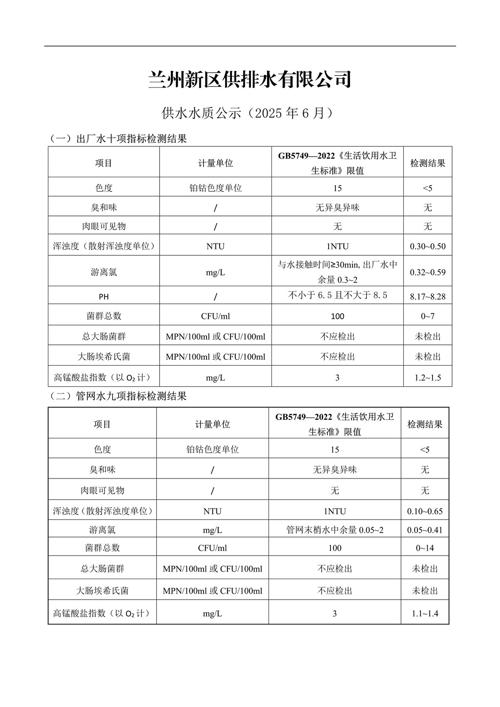 (2025年6月)兰州新区供排水有限公司供水水质公示